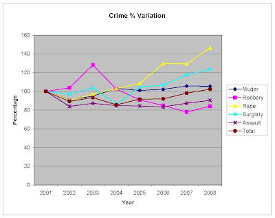 First, in the short term, the number of overall crimes did increase from 2004 through 2008. But counting from 2001 through 2008, the number of crimes are more or less stable, as a regression line drawn in the middle through the "Total" line would be nearly flat.
