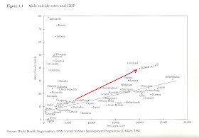 What is it about economic development that leads to suicide? Durkheim noted these factors: individualism, spirit of free inquiry, diversified economy, freedom of choice and greater wealth. At a first glance, these reasons make sense -- suicide is a highly individual act, and is often a result of a rational calculation. And Durkheim's insight has been proven to be broadly correct. In late-developing countries such as India and China, suicide rate rose like a clockwork, particularly in cities where the economic development was the most vibrant. In case of India, the suicide rate rose from 6.8 to 9.9 per 100,000 between 1985 and 1995. The highest suicide rates appeared Bangalore (30.3), Indore (30.1), Nagpur (22.1), and other cities with the most dynamic industrial revolution. In 2000, Indian people with high school degrees committed suicide at a rate more than twice of illiterate Indians. (19.8 versus 8.4 per 100,000)
