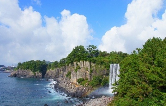 Keep driving south on Highway 1139 until you hit the southern coast and the Jusangjeolli Cliffs [주상절리대]. This spectacular black volcanic cliffs look like they are straight out of a sci-fi movie, with massive hexagonal columns standing over the water. Very close to the Jusangjeolli Cliffs, on the westside, is the gorgeous Cheonjeyeon Falls [천제연폭포]. It is close enough to walk between the two locations, and it would be less than a 5 minute drive. Cheonjeyeon is actually a system of three falls, and there is an arch bridge over the falls where you can get a fantastic view.