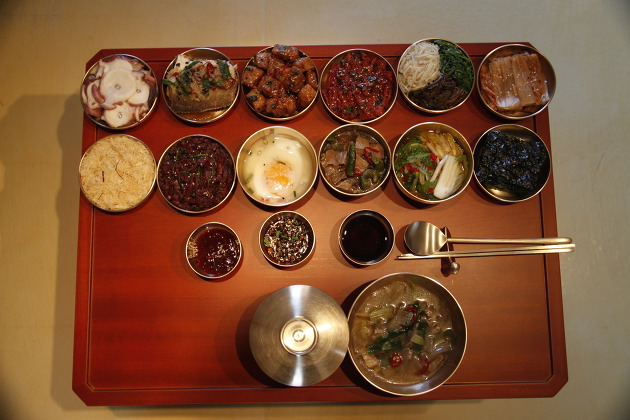 The pictured food above is hanjeongsik [한정식]. Many Koreans know it to be a traditional dish—but it is not. Before the Japanese invasion in the early 20th century, the people of the Joseon Dynasty never ate like this, with dozens of side dishes on the table. By Confucian law, the maximum number of allowed side dishes [banchan] was nine or twelve, which was only allowed to the king and the royal court. (The nine-banchan table looks like this. It is still opulent, without being crassly lavish.)